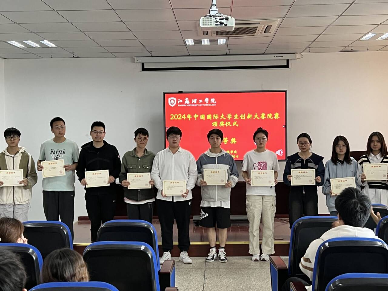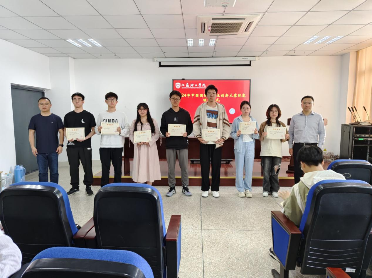 学院高度重视此次大赛,前期广泛动员同学们踊跃参加,共收到高教主赛道参赛作品49份,青年红色筑梦之旅赛道作品11份。学院组织专家对所有参赛作品进行了严谨公正的评审打分,依据创新性、实用性、技术难度等多维度标准,最终评选出主赛道一等奖5项、二等奖7项、三等奖12项,以及红旅赛道一等奖1项、二等奖2项、三等奖3项。张陈老师宣布了获奖名单,学院领导为各获奖团队颁发了获奖证书,以表彰他们在创新研究和实践中的卓越表现。